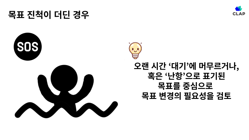환경(외부적 요인)의 변화가 없는 상황에서 적정 진척률보다 낮은 진행율을 보이거나, 오랜 시간 ‘대기’에 머무르거나, 혹은 ‘난항’으로 표기된 목표를 중심으로 목표 변경의 필요성을 검토합니다. 목표를 변경하기 전, 어떠한 부분에서 구성원이 어려움을 겪는지 확인해야 합니다.