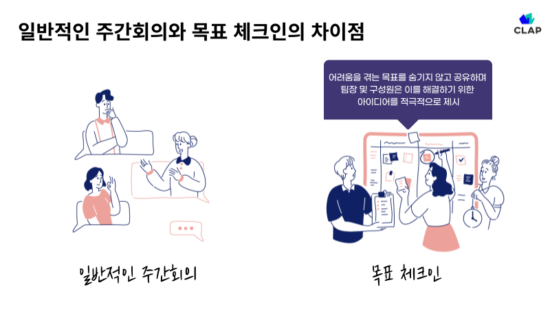 - 목표의 진행 현황에 대해서는 미리 CLAP에 기록하여 각자 확인 후 참석한다. 따라서 목표 체크인은 30분 이내로 짧게 운영되며 아무리 길어도 1시간을 넘지 않는다.