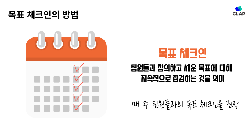 목표 체크인이란 팀원들과 합의하고 세운 목표에 대해 지속적으로 점검하는 것을 의미합니다. CLAP에서는 매 주 팀원들과의 목표 체크인을 권장합니다.