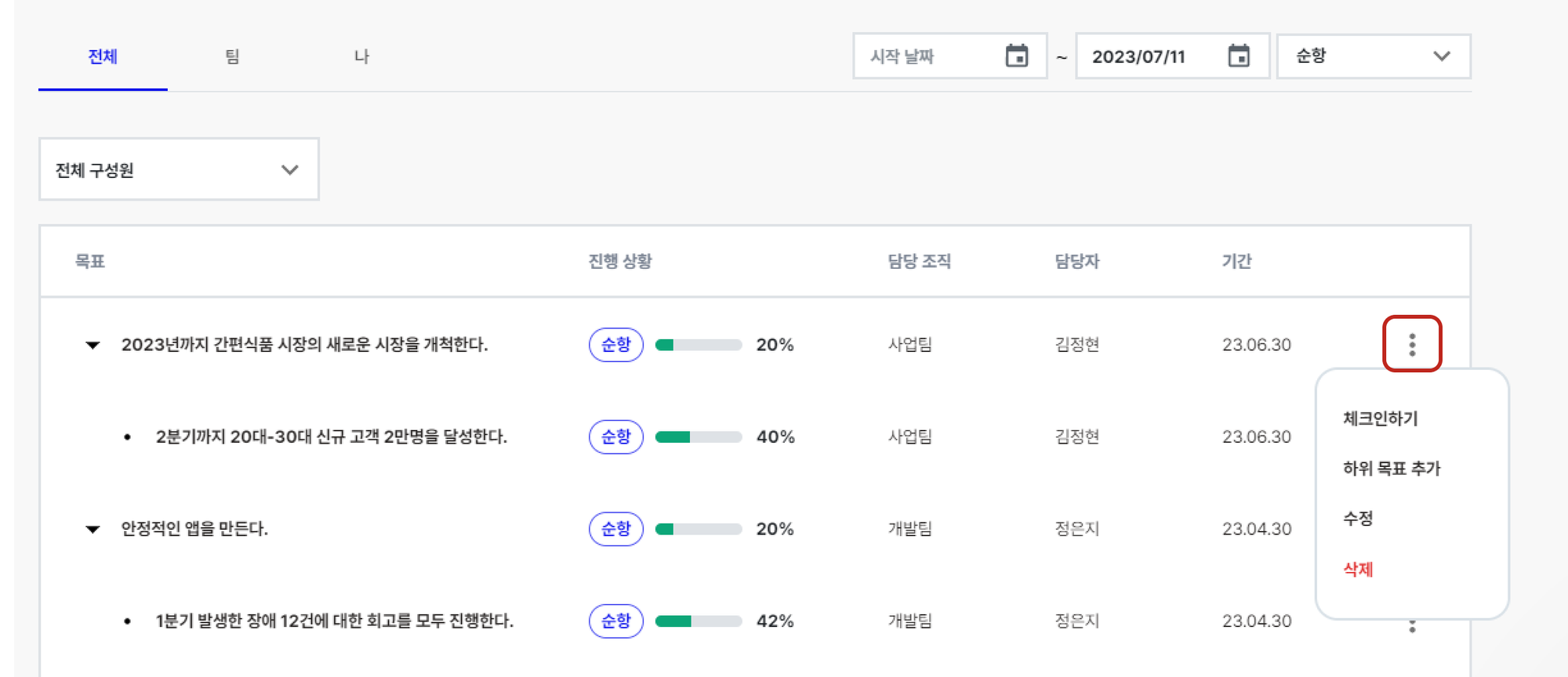 - 목표의 현황(순항, 난항, 대기, 중단, 완료), 진척도를 체크한다.