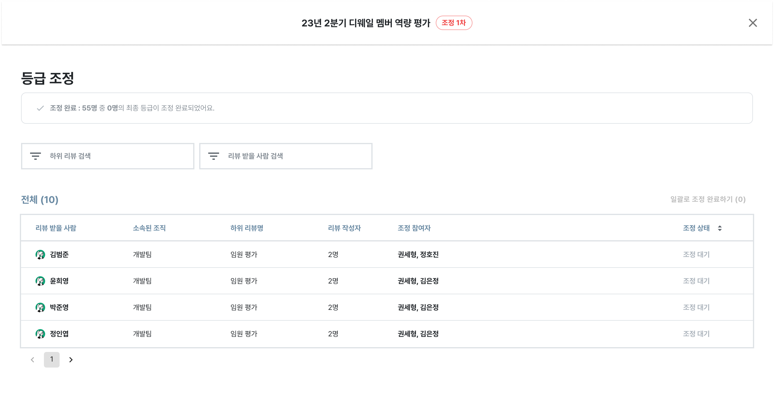 1차만 운영하는 경우, 1차의 조정 결과가 최종 등급으로 반영되며 해당 결과가 평가받는 사람에게 노출됩니다.