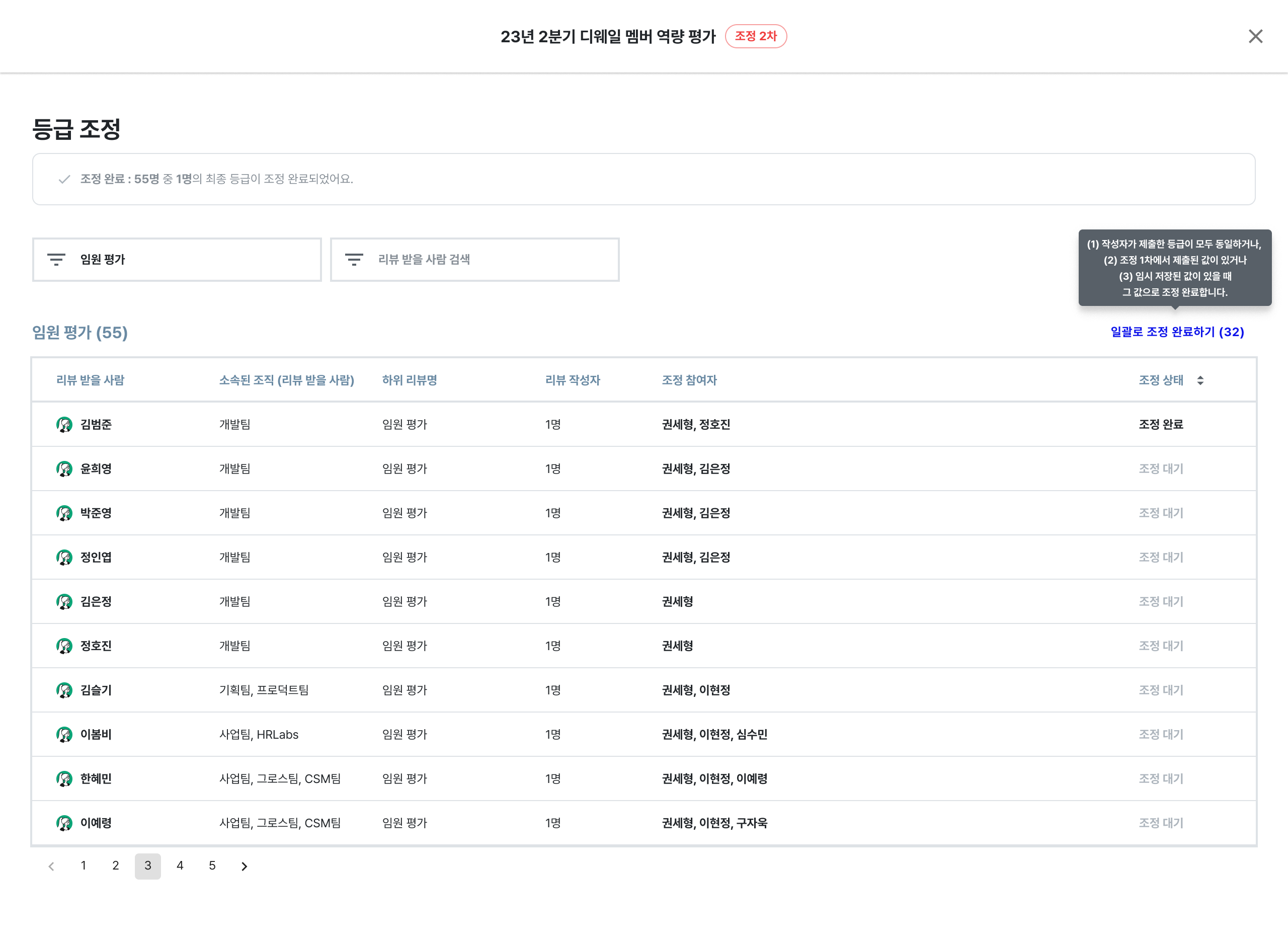 - 각 파트 구성원의 평가 결과에 대하여 파트장, 팀장, 경영지원팀(HR), 대표가 함께 모여 평가 등급 조정을 논의하는 경우