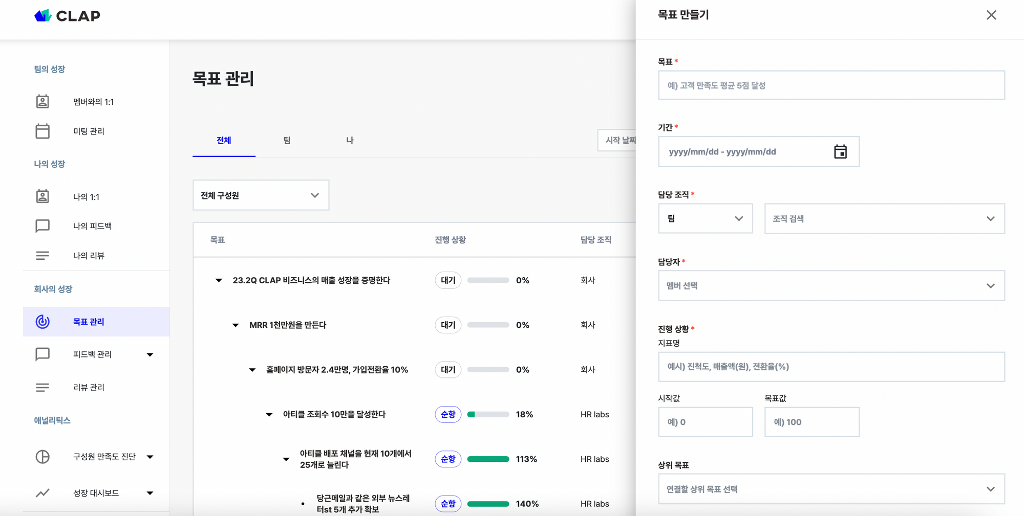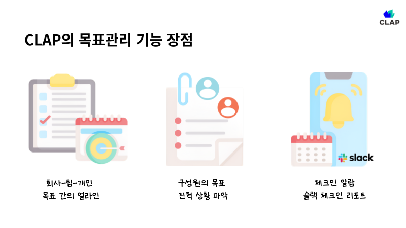 목표관리의 중요성에 대해 공감하신다면, CLAP의 목표관리 기능을 활용해 목표를 등록하고 지속적인 체크인으로 목표달성 현황을 한 눈에 확인해보세요.