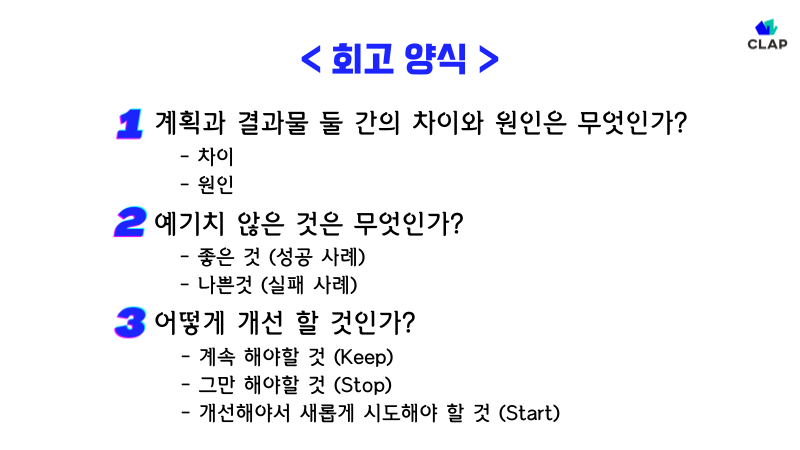 목표를 완료했거나, 혹은 목표를 위해 설정한 기간이 종료되었다면 회고를 꼭 진행해야 합니다. 회고를 통해 향후 목표 수립시 주의해야 할 사항, 다음 목표 때 추구해야 할 방향성을 알 수 있습니다.