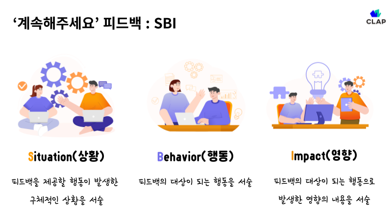 Google에서는 효과적인 동료피드백을 위해 SBI기법을 사용합니다. CLAP은 SBI 기법을 피드백의 기본적인 토대로 제시합니다.