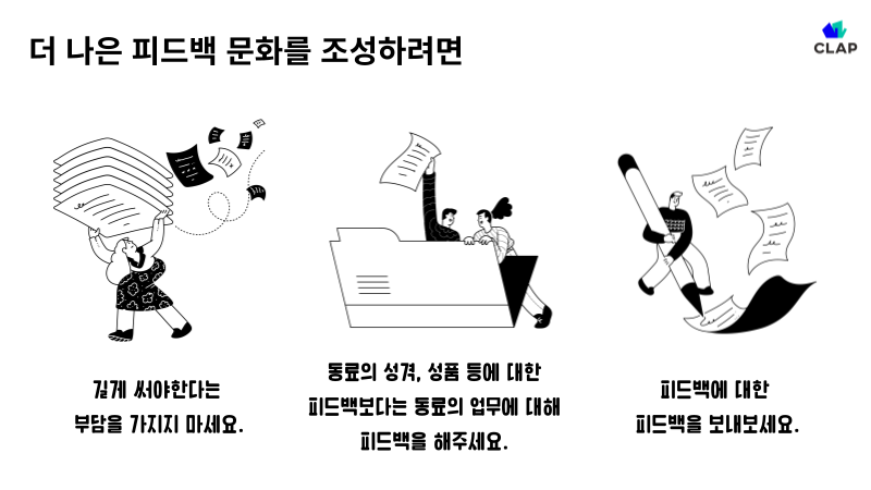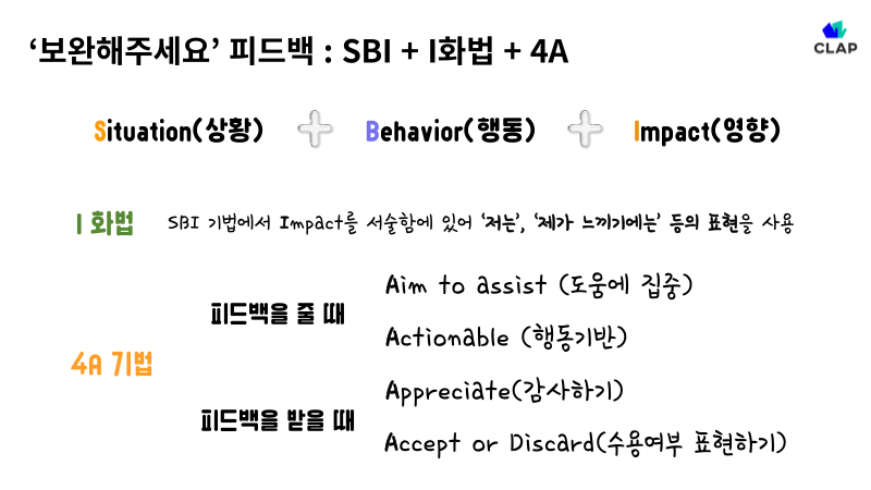 일반적으로 동료의 행동 교정을 목적으로 하는 비판적 피드백은 긍정적 피드백에 비해 어렵게 여겨집니다. 그러나 동료의 성장을 위해서는 협업 동료들의 솔직하고 투명한 피드백이 필요합니다. 비판적 피드백으로 인한 불필요한 오해를 줄이고, 동료의 성장을 지원하기 위해 CLAP에서는 SBI 기법과 더불어 I화법, 4A 기법을 함께 사용하는 것을 추천합니다.