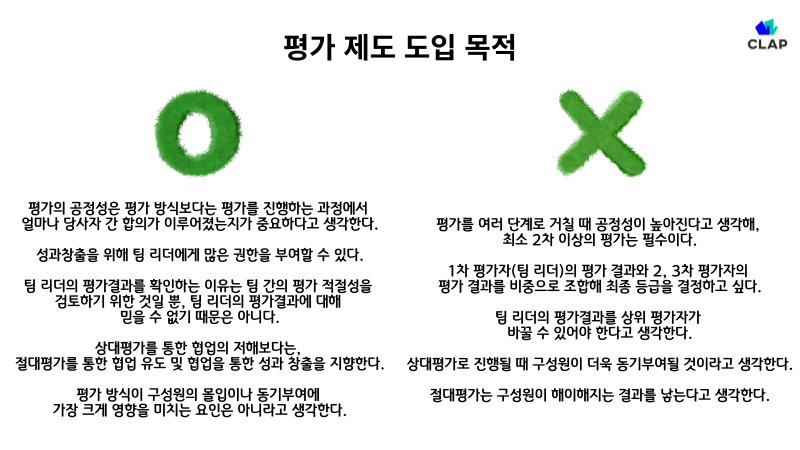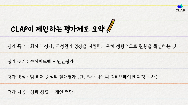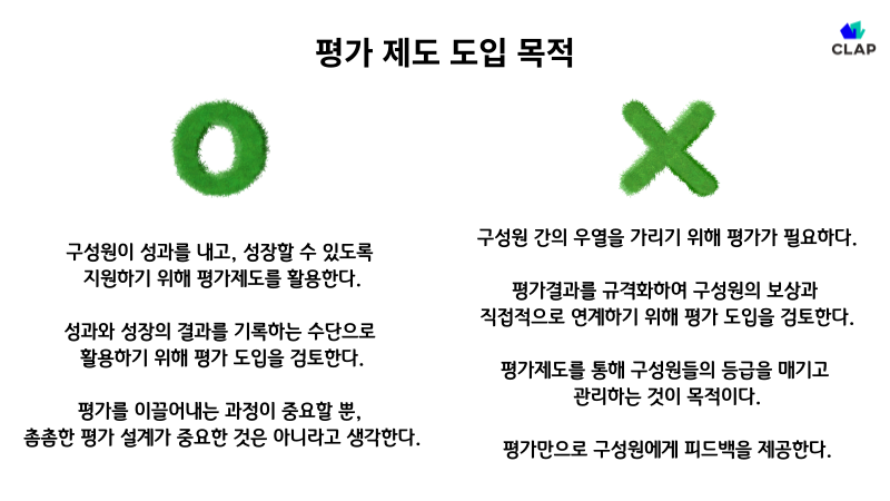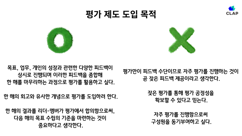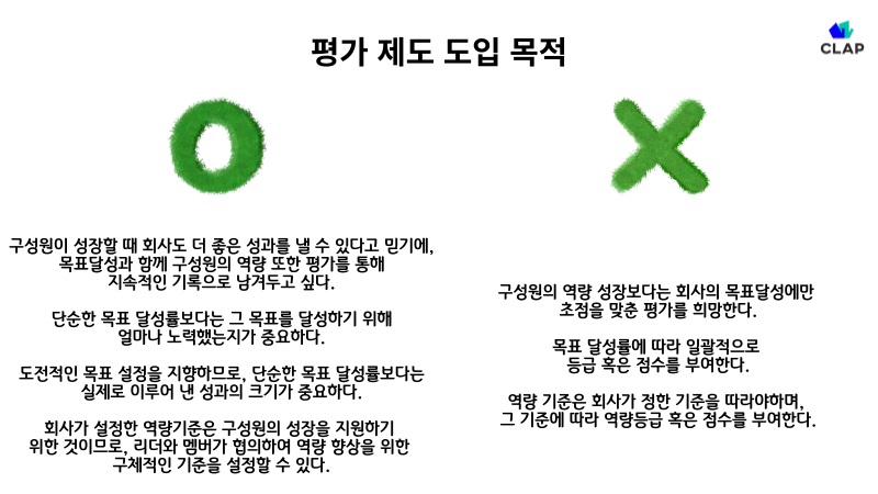 CLAP의 평가는 회사의 성과와 구성원의 성장 지원을 목적으로 합니다. 그리고 그 과정에서 회사의 성과, 구성원의 성장을 점검하고 기록하는 단계로서 ‘평가’가 존재합니다.