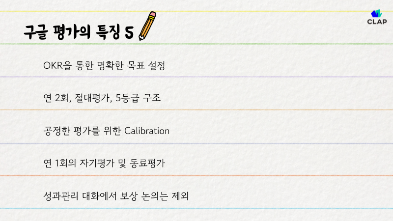 구글의 평가의 특징을 다섯 가지로 정리하면 다음과 같습니다.