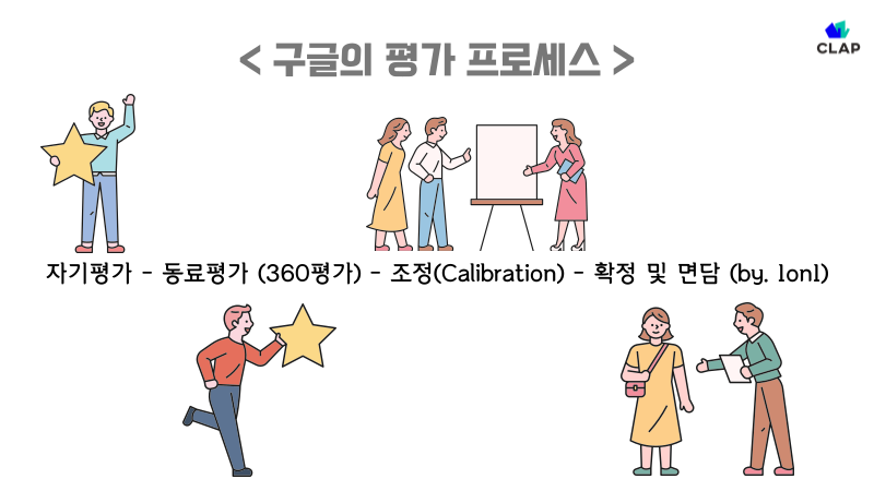 구글의 평가 등급은 총 5등급으로 구성되며 절대평가로 진행됩니다. 과거 41개의 등급으로 분기마다 평가했으나, 등급 단순화를 통해 ‘평가’에 집중하기 보다 ‘성과를 이루어내는 과정’의 대화를 늘리는 것에 초점을 맞췄습니다.