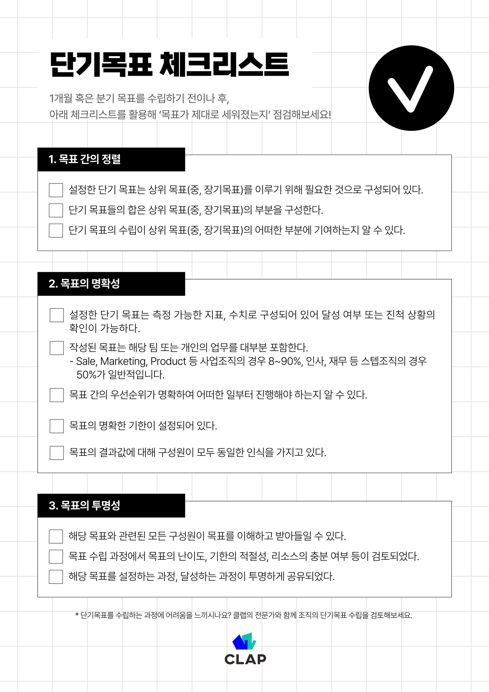 1개월 혹은 분기 목표를 수립하기 전이나 후, 아래 체크리스트를 활용해 ‘목표가 제대로 세워졌는지’ 점검해보세요!